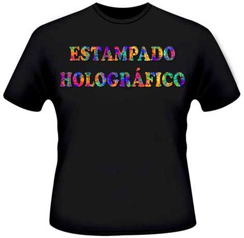 La impresión de remeras con el sistema holográfico o tornasolado logra un efecto visual muy atractivo y original. Es cada vez más usual ver remeras o prendas estampadas con este sistema multicolor que se ajusta adecuadamente a eventos o situaciones informales como remeras de danza, para ir al gimnasio o de uso cotidiano. El ejemplo de una remera estampada con material holográfico es el siguiente: